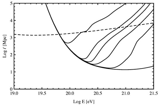 The calculated proton attenuation lengths as a function of proton energy modified by LIV for various values of (solid lines), shown with the attenuation length for pair production unmodified by LIV (dashed lines). From top to bottom, the curves are for , , , , , 0 (no Lorentz violation) [].
