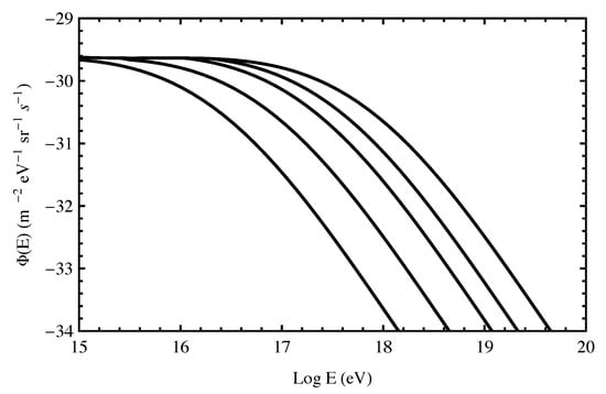 Using the energy loss rate given by Equation (40), a value for was obtained based on a model of the redshift evolution of neutrino sources and using Monte Carlo techniques to take account of propagation effects as discussed in Section 13 [,]. The upper limit on is given by []. Taking this into account, one gets the constraint . The spectra derived therein for the case also showed a pileup followed by a cutoff. The predicted cutoff is determined by redshifting the threshold energy effect.
