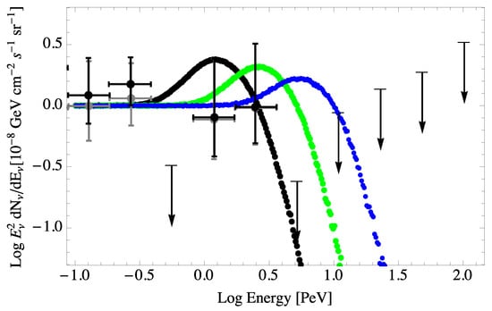 In both the and cases, the best fit matching the theoretical propagated neutrino spectrum, normalized to an energy flux of below 0.3 PeV, with the IceCube data corresponds to a VPE rest-frame threshold energy PeV, as shown in Figure 6 [,]. This corresponds to . Given that , it is again found that . As shown in Figure 7, values of less than 10 PeV are inconsistent with the IceCube data. The result for a 10-PeV rest-frame threshold energy is just consistent with the IceCube results, giving a cutoff effect above 2 PeV.