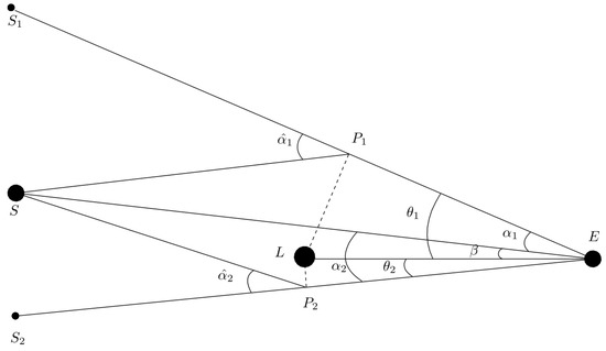 and are the images of the source S. The points and are the deflection points of the light rays deflected by the lens L and observed in E. and approximate the deflected photon geodesics.