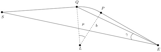 A remark is in order concerning the points P and Q in Figure 2: the angles in Figure 1 are uniquely identified unlike the angles in Figure 2. In other words, we could set the position of Q and P in different ways. Only after the determination of and we will be able to use (97). Nevertheless, we already have some constraints: must be smaller than , while must be small. However, the two points P and Q in Figure 2 can be determined by imposing a smooth connection (for instance a tangency condition) between the straight lines and and the curve [22].
