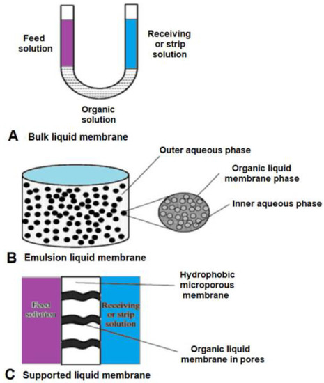 Representative device of chiral liquid membranes membranes: (A) bulk liquid membrane, (B) emulsion liquid membrane, and (C) supported liquid membrane (figure adapted and reproduced with permission from Ref. [74]).