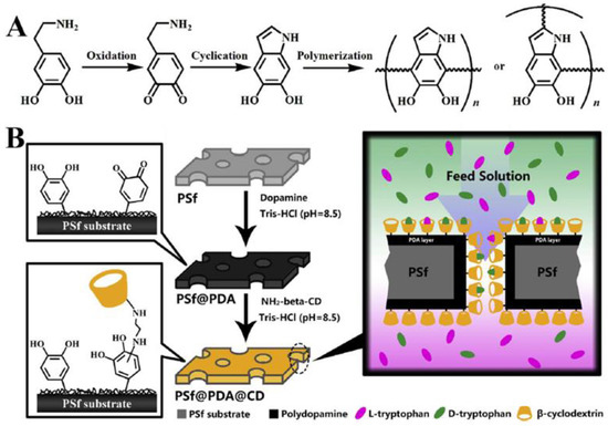 Representative example of membranes functionalized with immobilized chiral selectors: (A) the formation mechanism of PDA; and (B) procedure for preparation of a PSf-based enantioselective membrane (Reprint permission from Ref. [67]).