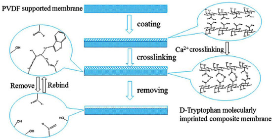 Zhou et al. described a totally green and clean preparation method for D-tryptophan imprinted composite membranes using the natural polymer sodium alginate as functional polymer, CaCl2 as crosslinking agent and water as solvent [145]. As supported membrane, the polyvinylidene fluoride membrane was chosen. No additional organic solvent or compounds were used. By comparing to other previous described works aiming at the separation of D-tryptophan [80,129,146,147], besides being environment friendly and low cost, this method was found to increasing the enantioseparation [145].