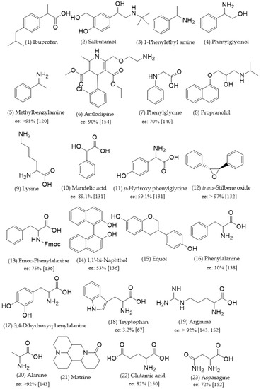 Several enantioselective membranes have been developed allowing the enantioresolution of diverse classes of chiral compounds including pharmaceuticals, amines, amino acids, etc. (Figure 5).