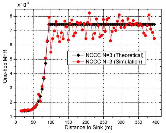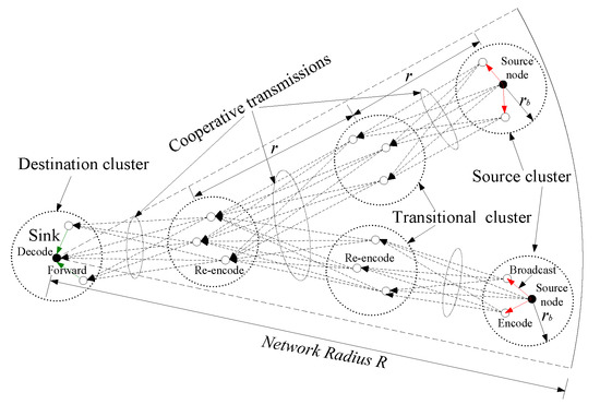 - Network-coding-based cooperative communications (NCCC). Reference [31] proposed a communication scheme whose main idea is the combination of coding techniques and cooperative communications. The scheme has two main operations: (a) the original data packets should be encoded before being sent from the source cluster and they should be re-encoded before being sent from the transitional cluster, where both encoding and re-encoding are performed using random network coding; and (b) in each hop, several sensor nodes with a certain probability of temporarily failing constitute a cluster to cooperatively send data packets. At the cost of acceptable delay, NCCC can achieve reliable performance. Although this scheme can achieve better reliability, the transmission delay is longer.