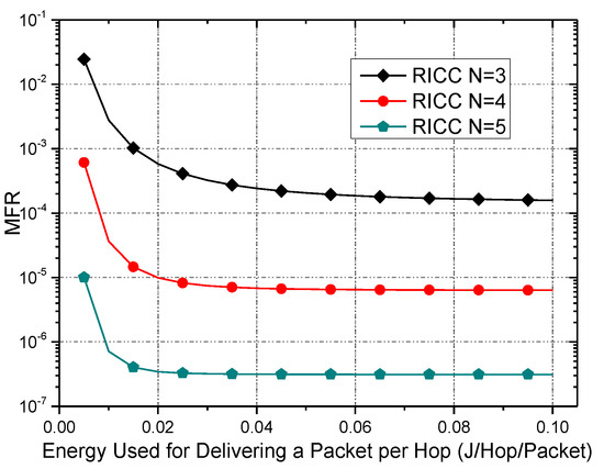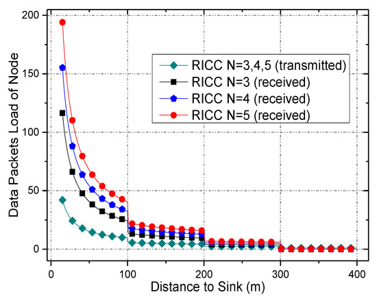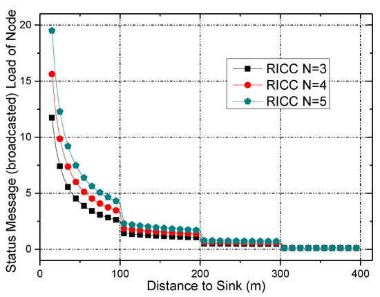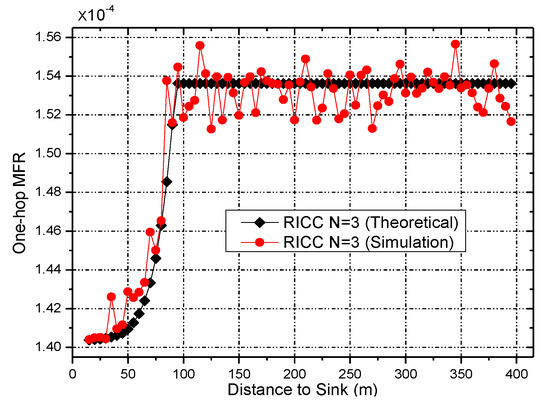 - End-to-end data collection reliability (denoted as ). This should be guaranteed, which means it should be higher than the minimum reliability, , required by the application. Let stand for the end-to-end reliability of a data packet generated by node , and let is the reliability of the packet at the i-th hop. Then, is as follows:Obviously, the goal of RICC can be summarized as Equation (4):