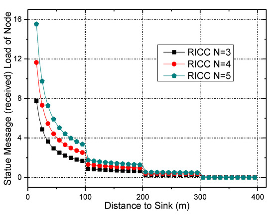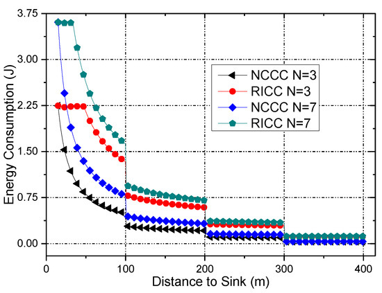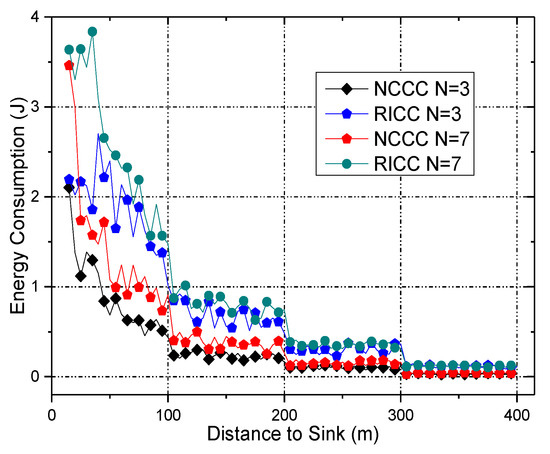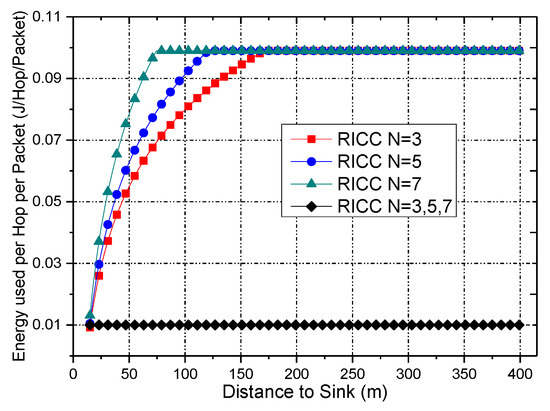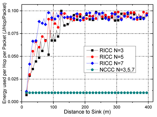 - A Reliability Improved Cooperative Communications (RICC) with adjustable data transmission power [31] is proposed, in which the residual energy in non-hotspots is fully utilized to increase the transmission power of nodes to improve the data transmission reliability, whereas in hotspot areas, the transmission power is unchanged to maintain the previous network lifetime. For cooperative communications, the higher the transmission power of the nodes is, the shorter the lifetime of the nodes is. Thus, if the data transmission reliability is kept the same as before, the network lifetime is damaged. Due to different nodes load different amount of data, the energy consumption of different nodes is different, the non-hotspots area has much energy left. Therefore, in this paper, RICC adopts higher transmission power in non-hotspot regions, while using the same transmission power in hotspots areas as in previous schemes. Because most nodes are in non-hotspot areas, RICC can effectively improve the data transmission reliability.To the best of our knowledge, for coding-based cooperative communication WSNs, RICC is the first data collection strategy that enhances the reliability without harming the lifetime.