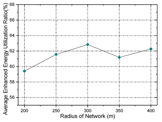 - Effective energy utilization (denoted as ). is the ratio of the used energy to the total energy in the network. Considering is the used energy of node , and denotes the initial energy: