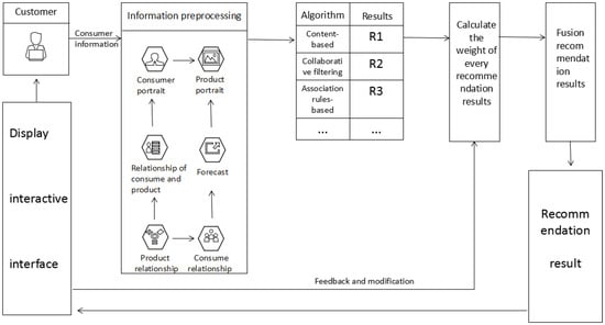 To construct an interactive recommendation system based on a hybrid algorithm of multiple recommendation algorithms, we followed the framework as outlined in Figure 1. The first phase is to preprocess the information of products and consumers, where retaining useful information and building relationships are the main tasks. The second phase obtains original recommendation results through various recommendation algorithms. The third phase calculates the weights for each result. A weight measures the importance of a recommended result. The fourth phase is to get the final recommendation results through fusing the original results of various recommendation algorithms. The last phase is to show the recommendation results to the customer through an interactive interface, and record the customer’s feedback information to correct the recommendation weights. Details are described next.