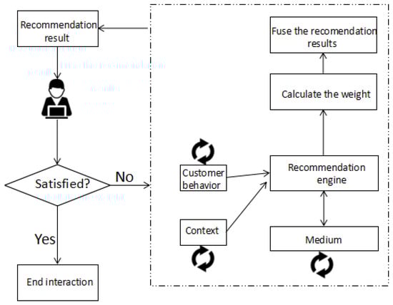 The recommendation system is not only based on customer history record, but also needs to be based on the current behavior data to give real-time feedback. The system continuously interacts with the customer and analyzes the customer feedback to correct and optimize the recommendation results. Interactivity realizes the dialogue between the customer and system. The goal of the recommendation system is to recommend products that best suit customers. Research shows that an effective recommendation system can inspire customers’ trust in the system []. The recommendation system has transparent system logic and provides detailed information about recommended products. Swearing et al. [] improved the recommendation method that allows customers to interact with the system more effectively, to make recommendations more effective. Felfernig et al. [] put forward the idea of case-based reasoning, which used the products’ characteristics to interact with the customer to determine the most appropriate products. Some researchers proposed interactive visualizations as a means to support interaction with recommendation systems at the ACM conference on Intelligent User Interfaces (IUI) in 2013 []. He et al. [] presented an interactive visualization framework that combines recommendation with visualization techniques to support human–recommender interaction.