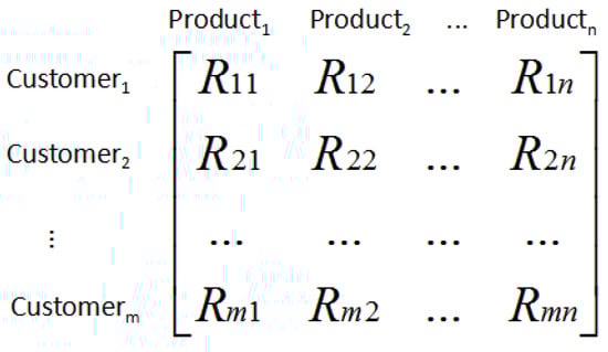 The CF algorithm, one of the most widely used techniques in recommendation systems, is based on a group of customers with the same interest []. CF uses the matrix of customers and products shown in Figure 3 to find the similarity between customers and products. Then, it combines the customer’s historical information to obtain the recommendation degree of the product, and produces the recommendation result according to the recommendation value. CF can be divided into two types: user-based CF and item-based CF.