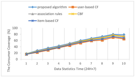 where , is the recommendation resource set at time equals in the recommendation system, and is the resource set of the consumer selection. The higher the consumer coverage, the stronger the coverage ability of the recommendation system to the consumer’s needs and features. The comparison of experiment results on consumer coverage is shown in Table 5 and Figure 4.