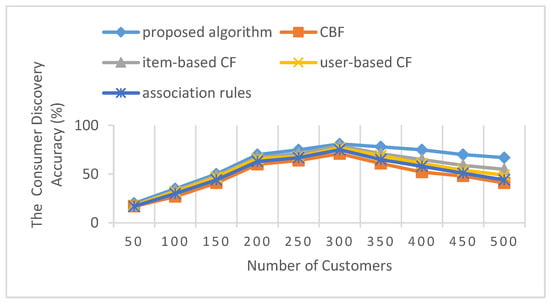 The above experiment compares the consumer discovery accuracy of four algorithms and the proposed algorithm by using different sizes of data. When the number of customers is 300, the accuracy for the proposed algorithm is 81%, as shown in Table 6. From Figure 5, we can see that the proposed method in terms of accuracy is higher than that of the other four algorithms. In the four algorithms, the consumer discovery accuracies become relatively stable with the continuous enrichment of customer information, and then begin to decrease after reaching their peak values. However, the proposed method allows consumers to interact with the system dynamically to change weights. Consumer feedback can adjust the recommended products in a timely manner, so the accuracy of the peak was higher and the accuracy decreased more slowly. This means that the strategy using the hybrid algorithm to analyze consumer behavior is more accurate. It has a positive impact on the quality of the recommendation rules. This advantage is more pronounced after the number of consumers increases to 300, as shown in Figure 5. On the one hand, the proposed algorithm can explore products similar to the customer’s previous interests, according to his/her browsing record. On the other hand, it can tap new requirements and interest points for the customer by fusing similar customers. In addition, we find that the consumer discovery accuracies of the five algorithms to old customers are not very different. However, with new customers, the different consumer discovery accuracies have a greater effect. Therefore, the recommendation system should be combined with a customer relationship management system in the future research.