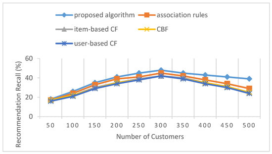 The recommendation recall is defined as the proportion of products selected by the customer to the total number of products recommended to the customer. In this comparative experiment, the situation is the same as that of Section 4.3. The differences of the experimental results are not obvious due to the limit of the number of subjects. This problem may reduce the experimental validity, so we further expanded the number of experimental subjects. The total number of customers increased from 200 to 500. Among them, the proportion of all types of consumers remained unchanged. The experimental results are shown in Table 7 and Figure 6.