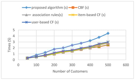As Figure 6 shows, the recommendation recall rate of the five algorithms tends to be stable with the richness of customers and resources. Moreover, due to the stability of customers’ needs, the recommendation recall begins to decline. However, the proposed algorithm has more advantages in the recommendation recall criterion, and maintains a high recall for a long time. This is due to the fact that consumer demand is always changing, while with traditional recommendation systems it is hard to recommend something new [,]. The proposed method combines a hybrid algorithm and interactive assignment together, achieves high performance and accuracy, and alleviates the cold-start problems in recommendation systems to some extent. The results demonstrate that consumers can enjoy the convenient and high-quality service produced by the recommendation system using the proposed algorithm. A good recommendation system not only helps consumers to find useful information, but also helps retailers to show the products of interest to consumers, providing both consumers and retailers with a win-win situation.