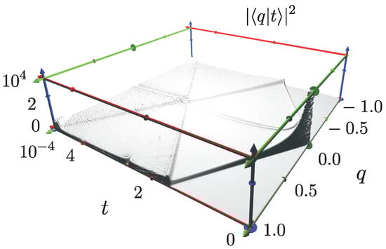 Three dimensional plot of the squared modulus of the un-normalized time eigenstate, in coordinate representation , using 2000 energy terms. Dimensionless units. The probability has larger values around classical trajectories starting at , including the ones with zero, negative and positive momentum. We also can notice the bouncing of the particle from the walls.