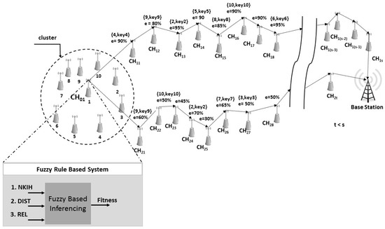 The authentication keys are shared by the cluster member nodes with the intermediate CHs after they are selected by e-CH. Therefore, the e-CH knows their IDs and distances as it does in [7,11,29].