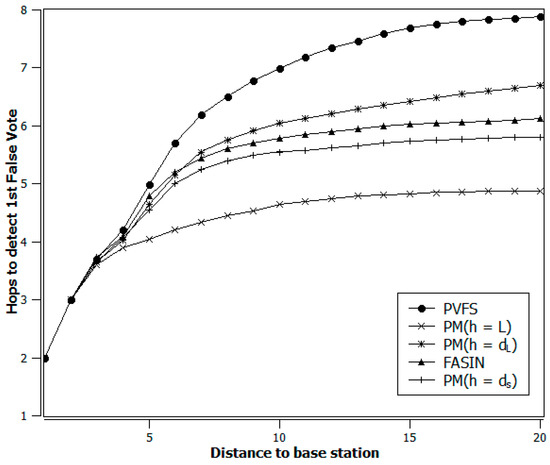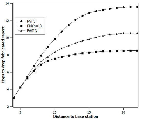 Figure 5 shows that, as long as the value of is same for all three schemes, i.e., PVFS, FASIN, and our proposed method, the early filtering of fabricated reports is better in our proposed scheme as the distance between the e-CH and the BS increases. It is extremely desirable to relieve the nodes closer to the BS of the task of verification because they contain more verification keys and must perform verification more often. All those reports for which reaches its threshold value are marked safe and are not verified any further, which eases the task of the verification nodes located farther from the e-CH.
