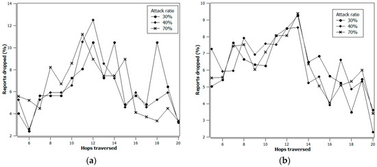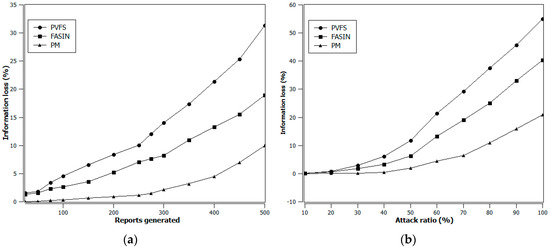 Information delivery and loss analysis. (a) Attack ratio = 60%; (b) Number of reports generated = 400.