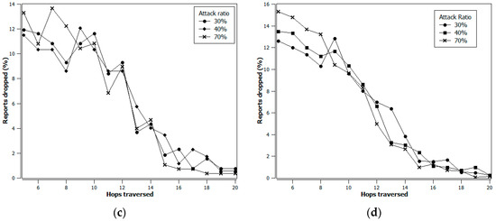 Wireless sensor networks (WSNs) represent a sustainable solution for continuous observation of arbitrary events in the physical sphere and consist of resource-constrained nodes installed in a range of hostile environments [1,2,3,4]. Sensor networks are predicted to intermingle with the physical world and also support various novel applications [5]. In most applications, sensor nodes are deployed in exposed environments, and therefore are susceptible to physical attacks, potentially compromising the node’s cryptographic keys [6]. Attackers can insert false sensing reports through compromised nodes, which both cause false alarms at the base station (BS) and deplete the limited energy resources of the individual nodes in the network [7]. False Report Injection Attack (FDIA) and False Vote Injection Attack (FVIA) are two serious attacks among several others that can occur in WSNs [7,8]. Sensor observations are temporally and spatially correlated in WSNs [9]. Spatial and temporal correlations in the observations of closely located sensor nodes are exploited to reduce the propagation of redundant data and multiple nodes authenticate the data to be forwarded by a single designated node or cluster head. Cluster-based organization helps reduce the communication overhead and data redundancy through data fusion and data collection [10]. However, a multitude of nodes in a cluster can add bogus Message Authentication Codes (MACs) to a genuine event data generated at the cluster. The cluster head forwards the same report, on a low-cost path, to the base station (BS). The verification nodes on the path attempt to verify the forwarded report by authenticating the MACs attached to it. The report is dropped as soon as the detected false MACs number hits a pre-set threshold value. Attaching bogus MACs to legitimate reports results in denial of service (DoS). Such reports are repeatedly generated and forwarded to the BS by the event reporting cluster head until the BS acknowledges its receipt. The regeneration, retransmission, and repeated verification of such reports causes drain of the limited energy resources in the sensor network. In FRIA, several nodes within a cluster conspire to fabricate a report about a non-existent event in the surrounding environment and attach MACs to it. The reception and forwarding and en-route verification of these fabricated reports drains a significant amount of the limited energy resources at the intermediate verification nodes [11]. For the sake of clarity, a cluster head that generates the report is referred to as an event-cluster head or as an e-CH, whereas all the other cluster heads are simply referred to as cluster heads or as CHs hereafter.