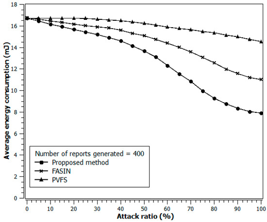 Figure 6 shows the average energy consumed in forwarding a false report before it is filtered by an intermediate verification node. Initially, when there is no false data insertion in the network and the sensor nodes are fully charged, the proposed scheme chooses the shortest path for data delivery like in PVFS and FASIN. However, the false data rate increases, and the energy of the intermediate nodes decreases with the passage of time. In the proposed scheme, the e-CH makes fuzzy inferencing about the path selection and chooses the best path given the current insertion rate of false data and the status of the energy of the intermediate paths. Whereas, FASIN and FVPS switch to the next shortest path for data delivery only after a node failure occurs on the first shortest path. Whenever FASIN switches to the available next shortest path, the verification nodes on that path are sparsely located due to initial probabilistic selection of the verification nodes. Therefore, false reports travel more hops than in the proposed method and consume more energy until FASIN improves the proximity of the verification node to the e-CH. In PVFS, verification nodes are probabilistically chosen only once and they remain fixed. The bend in the curve for PVFS in Figure 6 is due to the fact that verification nodes that are near the source cluster have a higher probability of being chosen as verification nodes on a longer path than on the shortest path as provided by Equation (2).