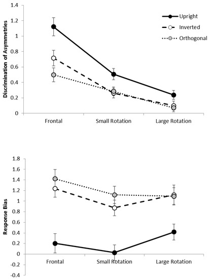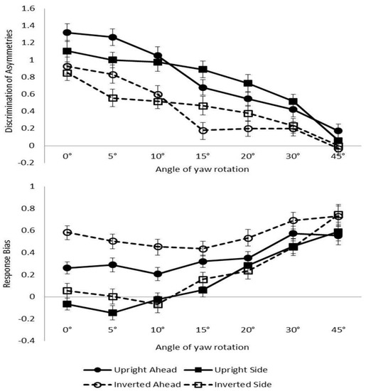 The collected data were converted into symmetry discrimination and response bias scores for each category of stimuli for each participant. Means are shown in Figure 2. Applying one-sample t tests, all conditions had discrimination levels significantly greater than zero except for large yaw rotations when the faces were either inverted, t(43) = 1.746; p = 0.088, or orthogonal, t(43) = 1.397; p = 0.170.