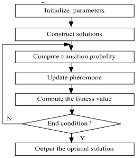 ACO algorithm was proposed by Dorigo [4]. It is a metaheuristic that is inspired by the behavior of real ants in search of the shortest path to food sources. Ants tend to choose the paths marked by the strongest pheromone concentration. The ACO algorithm is an essential system that is based on agents that simulate the natural behavior of ants, including the mechanisms of cooperation and adaptation. It simulates the techniques that are employed by real ants to rapidly establish the shortest route from a food source to their nest and vice versa without the use of visual information. The ACO algorithm consists of a number of cycles (iterations) of solution. In each iteration, a number of ants construct complete solutions by using heuristic information and the collected experiences of previous population of ants. These collected experiences are represented by using the pheromone trail, which is deposited on the constituent elements of a solution. The pheromone can be deposited on the components and/or the connections used in a solution depending on solving problem. The flow of ACO algorithm is illustrated in Figure 2.