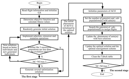 The flow of the new two-stage hybrid algorithm based on the GA and ACO (GAOTWSH) algorithm.