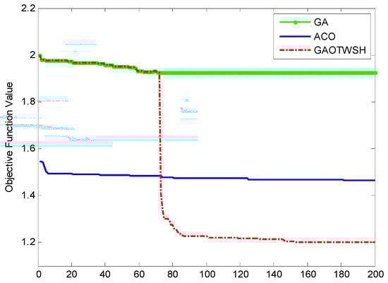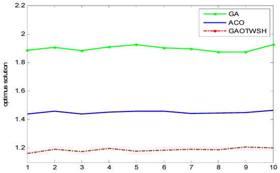 As can be seen from Table 5 and Table 6, Figure 4, Figure 5 and Figure 6, the optimal value and the average optimal value of the objective function is 1.873 and 1.896, and the least running time and average running time is 126.3 s and 128.3 s by using the GA, respectively. The optimal value and the average optimal value of the objective function is 1.431 and 1.463, and the least running time and average running time is 162.2 s and 165.4 s by using the proposed ACO algorithm, respectively. The optimal value and the average optimal value of the objective function is 1.164 and 1.188, and the least running time and average running time is 168.9 s and 173.4 s, by using the proposed GAOTWSH algorithm, respectively. As is known from Table 5 and Table 6, Figure 4, Figure 5 and Figure 6, the optimal value and the average optimal value of the objective function by using the proposed GAOTWSH algorithm are the least optimization value than the optimal values and the average optimal values of the objective function by using the GA and ACO algorithms. The experiment results show that the proposed GAOTWSH algorithm can obtain the least optimization value; it has better optimization performance in solving the gate reassignment problem. But, the least running time and average running time by using GA is the least time. The proposed GAOTWSH algorithm need more time to solve the gate reassignment problem due to two hybrids running.