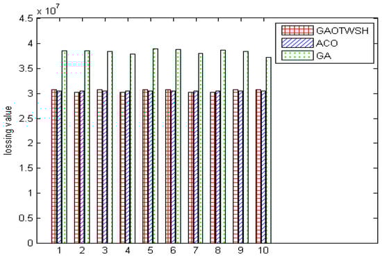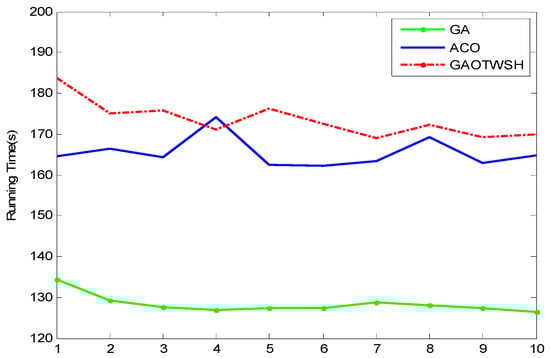 In order to demonstrate the optimization performance of the proposed GAOTWSH algorithm, the GA and ACO algorithm are selected to solve the constructed gate reassignment model. The comparison result for solving the constructed objective function is shown in Table 5 and Figure 4. The comparison result of running time for solving the constructed objective function is shown in Table 6 and Figure 5. The process of iteration for solving the constructed objective function is shown in Figure 6.