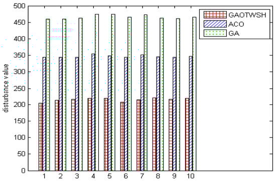 In order to further analyze the optimization performance of the proposed GAOTWSH algorithm, the objective function of the loss of passengers, airport operating and airlines, and the objective function of the disturbance value of the gate reassignment for delayed flights are, respectively, selected to study and analyze here. The comparison result of the disturbance value is shown in Table 7 and Figure 7, the comparison result of the loss of passengers, airport operating, and airlines is shown in Table 8 and Figure 8.