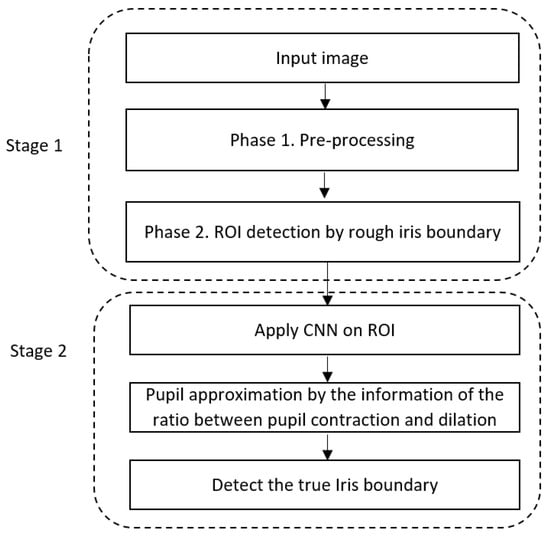 Figure 1 shows an overall flowchart of the proposed two-stage iris segmentation method. In the first stage, the rough iris boundary is obtained from the input image to define ROI for next stage. The resultant image from Stage 1 includes parts of the upper and lower eyelids and other areas, such as skin, eyelashes, and sclera. Consequently, the true iris boundary needs to be identified. In the second stage, within this ROI (defined by Stage 1), CNN is applied, which can provide the real iris boundary with the help of learned features. Considering the standard information of the ratio between pupil contraction and dilation, pupil approximation is performed, and finally, the actual iris area can be obtained.