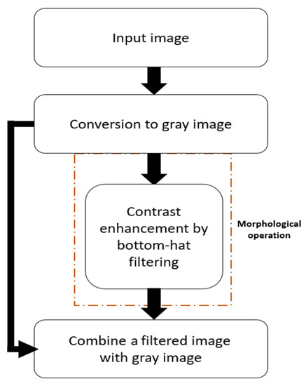 In Phase 1, as shown in Figure 2 and Figure 3c, the RGB input image is converted into grayscale for further processing, and morphological operation is applied through bottom-hat filtering with symmetrical structuring element disk of size 5 for contrast enhancement. Finally, two images of the gray image and resultant image by bottom-hat filtering are added to obtain an enhanced image as shown in Figure 3d.