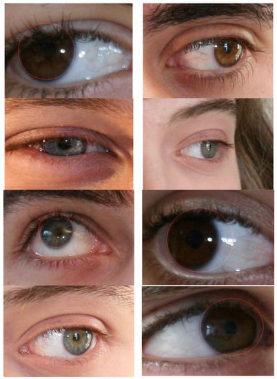 In this study, we used the NICE-II training database, which was used for NICE-II competition [42]. The database includes extremely noisy iris data of the UBIRIS.v2. This database contains severely noisy 1000 image of 171 classes. The size of the image is 400 × 300 pixels. The images of the iris were acquired from people walking 4–8 m away from a high-resolution visible light camera with visible light illumination [43]. Therefore, this database includes the difficulties, such as poorly focused, off-angle, rotated, motion blur, eyelash obstruction, eyelids occlusions, glasses obstructions, irregular SR, non-uniform lighting reflections, and partial captured iris images as shown in Figure 10.