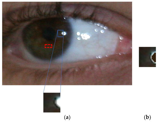 However, if the mask is extracted from the bright SR region, the characteristics of the pixels of the mask can be changed as shown in Figure 8a, which can increase the error of iris segmentation by CNN. To solve this problem, if the bright pixels whose gray level is higher than 245 exist inside the mask, they are replaced by the average RGB value of the iris area (the red dotted box in Figure 8a) as shown in Figure 8b. The threshold of 245 was experimentally found with training data. Here, we can reduce the effect of SR on the iris segmentation by CNN. The position of the red dotted box is determined based on the rough iris boundary detected in Stage 1. If the dark pixel exists inside the box because the dark pupil can be included in the box, the box position is adaptively moved into the lower direction until it does not include the dark pixel, and the average RGB value is extracted in this box.