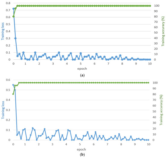 In our proposed method, we fine-tuned the VGG-face model using 500 iris images for classification of two classes (iris and non-iris). For two-fold cross validation, we used the first 500 images and the other 500 images for testing. From the first 500 iris images for training, we have 9.6 million images of 21 × 21 pixels from the iris ROI for training, and in the second training for cross validation, we have 8.9 million images of 21 × 21 pixels from the iris ROI. During the CNN training, stochastic gradient descent (SGD) is used to minimize the difference between the calculated and desired outputs with the help of the gradient derivative [46]. The number of the whole training set divided by a mini-batch size is defined as iteration. The total time taken for the complete training including all the iterations is set as 1 epoch, and the training was executed several times as per a pre-determined epoch. In this study, CNN was trained by 10 epochs. For the fine-tuning of VGG-face, the optimum fine-tuning model was experimentally found based on the optimal parameters of initial learning rate of 0.00005, the momentum value of 0.9, and the size of the mini-batch of 20. The detailed explanations of these parameters can be found in the following literature [47]. Figure 11a,b show the curves of average loss and accuracy with training data in case of two-fold cross validation. Epoch count is represented on the X-axis, whereas the right Y-axis represents the training accuracy and the left Y-axis shows the training loss. Depending on the learning rate and mini-batch size, the loss varies. While training, it is important to reach the minimum training loss (maximum training accuracy); therefore, learning rate should be decided carefully. The loss value decreased dramatically with a higher value of the learning rate, which can deteriorate the loss value with reaching to a minimum. In our proposed method, the finest model in which the training loss curve converges to 0% (training accuracy of 100%) is used for testing as shown in Figure 11. To have fair comparisons by other researchers, we have made our trained CNN models publicly available through [33]. Figure 12 shows the examples of trained filters of 1st convolutional layer of Table 2 in case of two-fold cross validation.