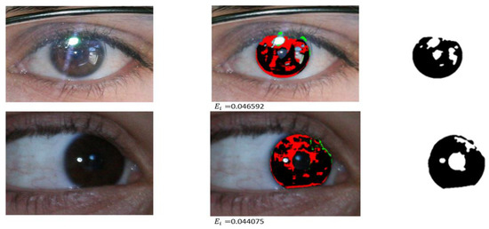 The third type of segmentation methods is composed of active contours and circle fitting-based methods [22,23]. A similar approach is used in the local Chan–Vese algorithm, where a mask is created according to the size of the iris, and then an iterative process determines the true iris boundary with the help of the localized region-based formulation [24]. However, this approach shares the drawback faced by other active contour-based models, i.e., it is usually prevented by the iris texture during iteration, and considers the iris pattern as the boundary, which results in erroneous segmentation. On the other hand, active contour-based methods are more reliable in detecting the pupillary boundary because of the significant difference in visibility.