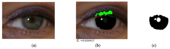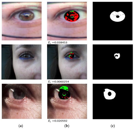 Examples of incorrect segmentation of the iris region by our proposed method. (a) Original input images; (b) segmentation results with corresponding ; (c) ground truth images (the false positive and false negative errors are shown in green and red, respectively. The true positive case (iris pixel is correctly classified into iris one) is shown in black).