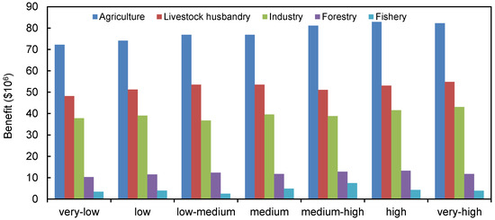 Figure 2 represents the benefits under various pollutant discharge allowances and the system benefit, indicating that a higher allowance would correspond to a higher benefit. For instance, when the allowable pollutant discharge changes from very low to very high, the total benefit (i.e., sum of benefit of each activity) would be raise from $172.1 × 106 to $195.7 × 106. Decisions at a higher allowable pollutant discharge would lead to a higher system benefit, but the reliability in fulfilling the environmental requirements would decrease; on the contrary, decisions at a lower allowable pollutant discharge would lead to a decreasing of risk for violating the pollutant discharge constraints, but with a lower system benefit. It demonstrates a trade-off between environmental requirement violation risk and benefit due to the uncertainties existing in various system components. In practice, when the plan aims to a higher system benefit, the environmental requirements may not be adequately satisfied; contrarily, planning with a lower system benefit may guarantee that the requirements be met. Additionally, the benefit of agriculture activity would take the largest proportion in total benefit and would increase slightly with the raising of pollutant discharge allowances. Moreover, the benefit of fishery would be stable at a low level, approximately occupying 2.1% of the total benefit.