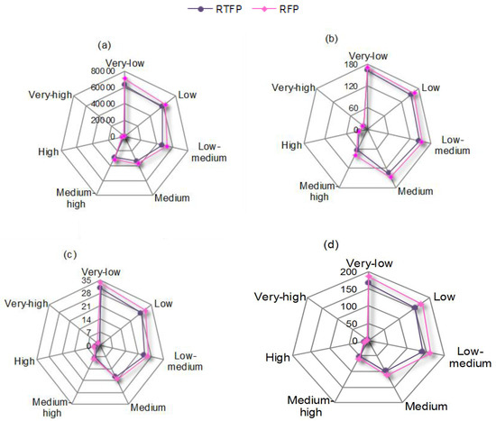 Figure 4 displays the excess pollutant discharges under different pollutant discharge allowance levels corresponding to RFP and RTFP. It is indicated that amounts of excess pollutant discharges would reduce with the increased levels. For instance, under RTFP, the amounts of excess soil loss, COD, TP, and TN discharges would be 52.3 × 103, 152.1, 22.4, and 99.2 t under low pollutant discharge allowance level; in comparison, under high pollutant discharge allowance level, they would respectively decrease to 1.3 × 103, 8.2, 7.2, 5.4 t. In general, results discover that a more restrictive pollution control would result in a higher excess pollutant discharge while a looser pollution control would bring on a lower excess pollutant discharge.