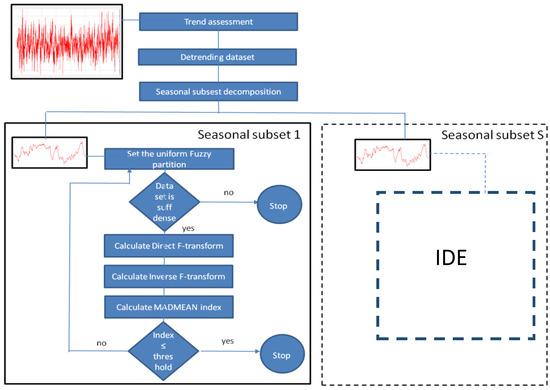 In the TSSF method, we essentially adopt the same procedure, but we prefer to use the MADMEAN index because this index is more robust than other forecasting indexes, as proven in [34]. We emphasize that the dimension of the optimal fuzzy partition can vary with the seasonal subset. In Figure 1, the TSSF method is synthetized in detail.