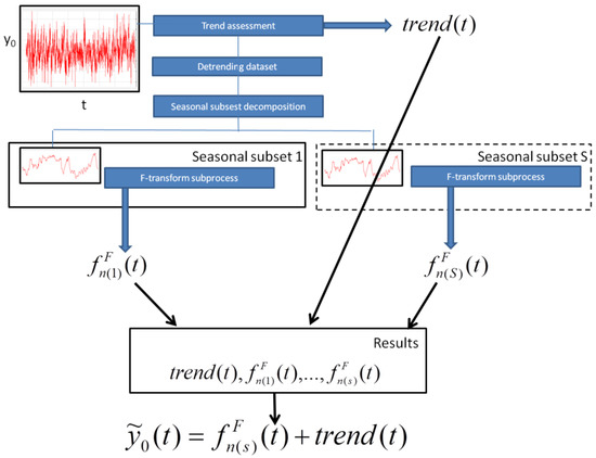 To forecast a value of a parameter y0 at the time t, we calculate the sth seasonal subset of cardinality n(s), in which the time t is inserted. Then, we consider the sth inverse F-transform . The forecasted value of the parameter is given by the formula , where trend(t) is the value of the polynomial trend at the time t. Figure 2 illustrates the application of the TSSF for forecasting analysis.