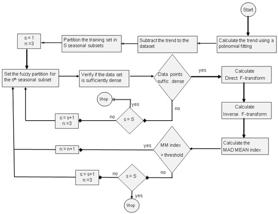 If Equation (14) is greater than an assigned threshold, than the process is iterated considering a fuzzy partition of dimension n:= n + 1; otherwise, the iteration process stops. Our algorithm is illustrated in Figure 3.