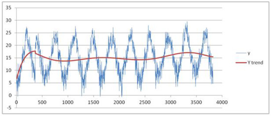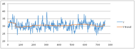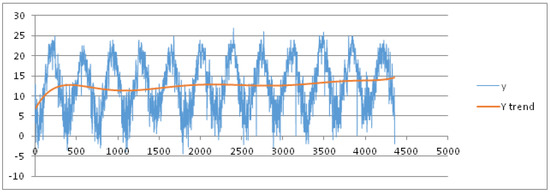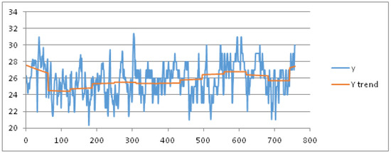 We now present the results of other experiments in which the variation of the min temperature is explored during the years. We assume the month as seasonal period: the training dataset is formed by all the measures recorded from 1 January 2003 to 31 December 2015. It is partitioned into 12 seasonal subsets corresponding to 12 months of a year. After applying the pre-processing phase, we set the threshold of the MADMEAN index to the value 6. In Figure 8, we show the data and the trend obtained using a best fit polynomial of nine degree (see Appendix A).