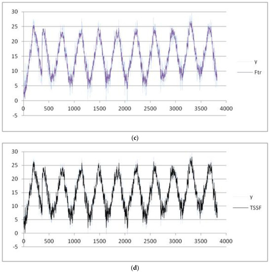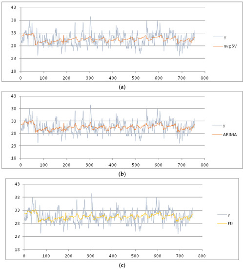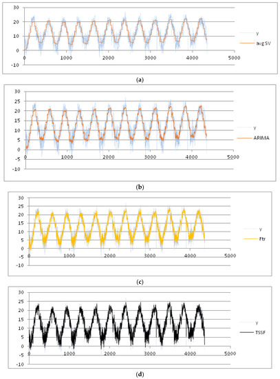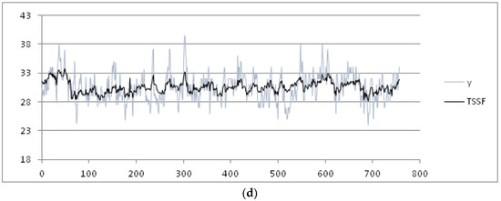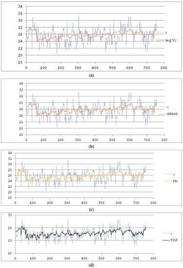 (a) Results obtained for the mean temperature by using the avgSV method; (b) results obtained for the mean temperature by using the ARIMA method; (c) results obtained for the mean temperature by using the F-transforms method; and (d) results obtained for the mean temperature by using the TSSF method.