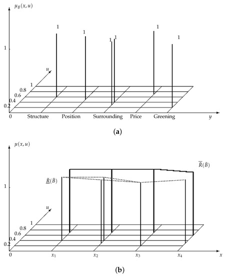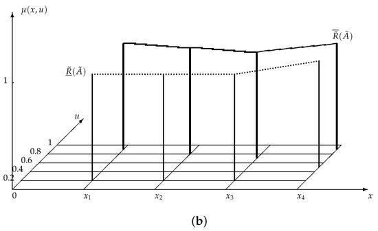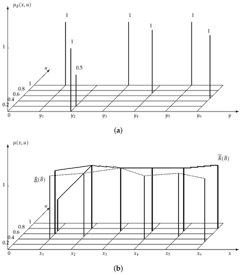 (a) A type-2 fuzzy set , which is defined in Y; (b) the lower approximation and the upper approximation of with respect to , which are type-2 fuzzy sets defined in X. The solid lines depict the upper approximation ; the dotted line depicts the lower approximation .