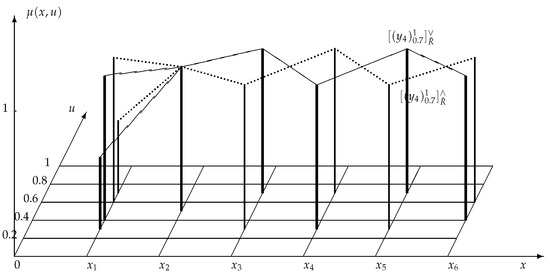 are embedded type-2 sets of the lower approximation and the upper approximation of with respect to (Figure 1b) can be calculated as follows: