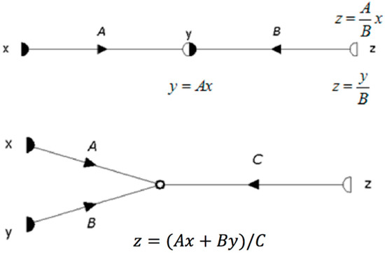 Graphs are geometrical structures that can represent linear equations. They relate magnitudes (variables) by graphic interconnections, following a few rules. A variable is represented by a small circle, called a “node”. White and black colors are used to indicate the orientation of the nodes, which is analogous to the sides of the equation, in standard algebra: black nodes are “sources”, that is, the input variables one has to handle to obtain the output variables called “sinks”, which are indicated by white nodes. The line connecting two nodes is called “branch” and the corresponding label is termed “transmittance”, which indicates that the relation between the interconnected variables. Furthermore, if this transmittance is not specified for a branch, it will be understood that it has the value 1. Branches with transmittance zero are not drawn. Figure 1 shows some flow graph representation of linear equations.