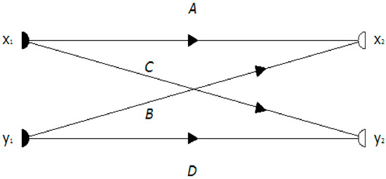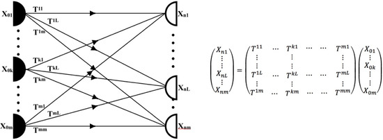 there exist possible paths connecting the input nodes with the output ones (Figure 4). These paths are defined by an ordinal (1 ≤ i ≤ Nm,n), which, as a consequence, is attached to a characteristic Path-Set that determines the path along the graph and a Path-Value that is considered as the product of the transmittances corresponding to each branch along the path. Once the path values are calculated, the transmittances of the branches of the residual graph are calculated through Equation (8), which are homologues to the matrix elements representing the system. For better organization, simplicity, and in order to avoid calculation mistakes, we suggest that all of the calculations to be put in tables. Table 4 and Table 5, and Figure 10 summarizes the process.